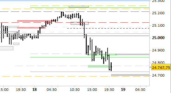 Dobbiamo necessariamente rimanere in osservazione fino a domattina, a causa delle indicazioni contraddittorie che stanno giungendo dai prezzi. La violazione ribassista dell'ex supporto di breve periodo a 24760.00 ha determinato l'interruzione del segnale di rimbalzo che stavamo seguendo. Si sono formati livelli di verifica a 24870.00/24875.00 (resistenza) e 24690.00/24695.00 (supporto), da cui adesso dobbiamo attendere segnali. Lo spazio fra questi livelli rappresenta una probabile zona di stabilizzazione.