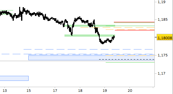 cross eur/usd, grafico a barre da 30 minuti. Prezzi al 19/02/26, ore 9.09, last 1.1800