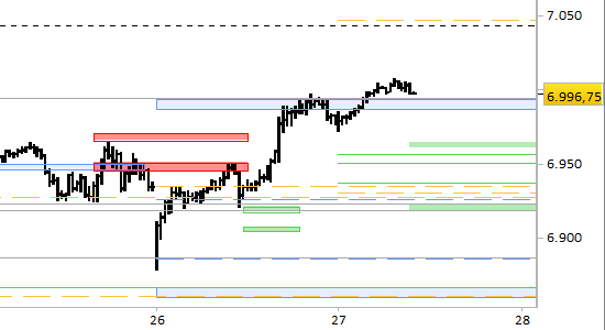 Per quanto riguarda i livelli di brevissimo periodo (=1-2 sedute) lo scenario appare favorevole ad un allargamento del rialzo fino a 7043.50/45.00, ma prima ci aspettiamo un riavvicinamento provvisorio ai supporti disposti oggi a 6962.00/65.00 e 6918.00/22.00. Solo con rilevazioni inferiori a 6918.00 sarebbe necessaria una revisione del quadro intraday.