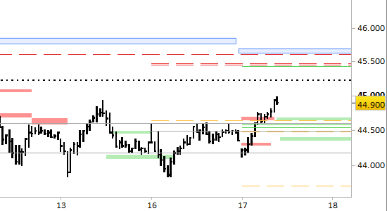 I prezzi hanno ignorato i livelli di resistenza di breve periodo, raggiungendo massimi a 44970. Lo scenario di medio periodo è intatto, ma i livelli fino a domani (=breve periodo) sono da rivedere.