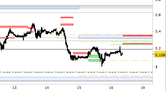 future natural gas, grafico a barre da 30 minuti. Prezzi al 16/01/26, ore 8.21, last 3.138