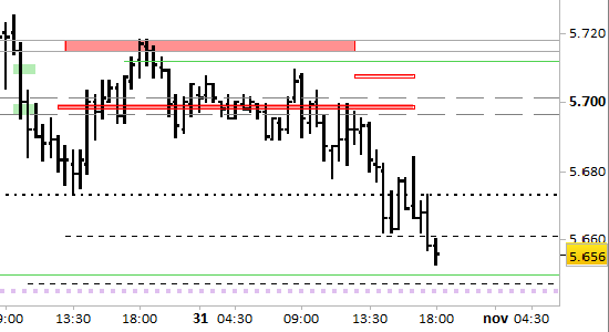 future Eurostoxx50, grafico a barre da 30 minuti. Prezzi fino al 31/10/25, ore 18.20, last 5656