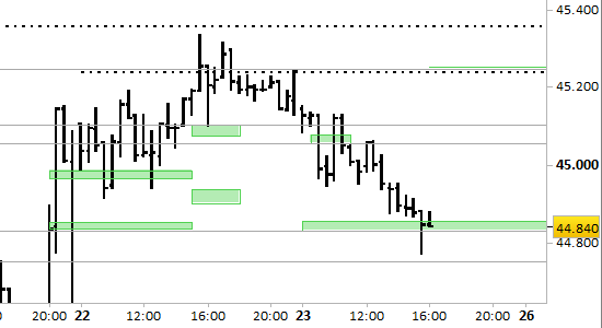 future FtseMib, grafico a barre da 30 minuti. Prezzi al 23/01/26, ore 16.06, last 44840