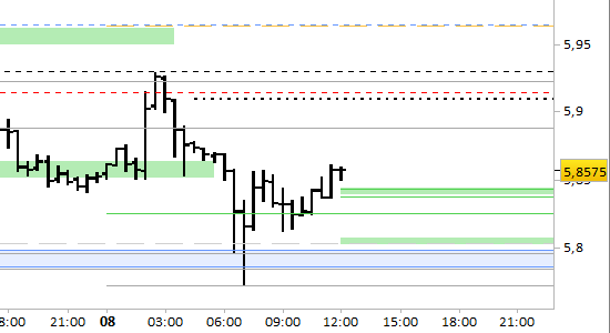 Per quanto riguarda lo scenario fino a domani (brevissimo periodo), la posizione long aperta il 06/01 a 6.0320 è stata chiusa in stop a 5.8495. Le aspettative sono di recupero fino a 5.9090, dopodichè dovremo attendere segnali per anticipare eventuali nuovi arretramenti. I supporti fino a domani si trovano a 5.8380/8425 e 5.8015/8075. Il segnale è long a mercato e su test del primo supporto. Stop sotto 5.8015 senza attendere alcuna conferma.