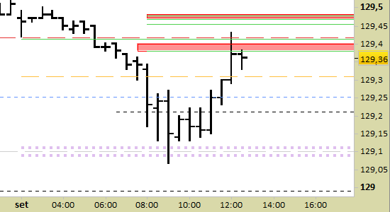 Intendiamo rimetterci in osservazione in attesa della formazione di nuovi segnali dalle resistenze, che attualmente sono ferme a 129.38/41 e 129.45/48. Attendiamo indicazioni nel pomeriggio.