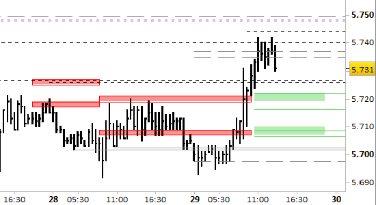 future Eurostoxx50, grafico a barre da 30 minuti. Prezzi fino al 29/10/25, ore 13.47, last 5731
