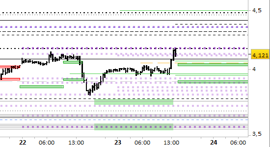 future natural gas, grafico a barre da 30 minuti. Prezzi fino al 23/12/25, ore 14.27, last 4.121