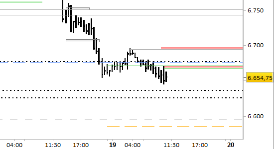 e.mini S&P future, grafico a barre da 30 minuti. Prezzi al 19/03/26, ore 10.37, last 6654.75