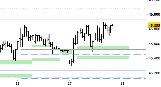 Non ci sono le condizioni per alzare i supporti di breve periodo, che fino a domani sono confermati a 45525/45545 e 45400/45420. I supporti sorreggono proiezioni rialziste fino a 46085, da raggiungere passando per la resistenza intermedia a 45910/45930. Da quest’ultima potrebbero ancora scattare provvisori arretramenti in seno al movimento atteso. Il segnale long è valido solo con prezzi stabilmente superiori a 45400.