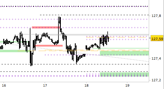 Conserviamo la posizione long aperta a 127.56. Stop sotto 127.23 senza attendere alcuna conferma.