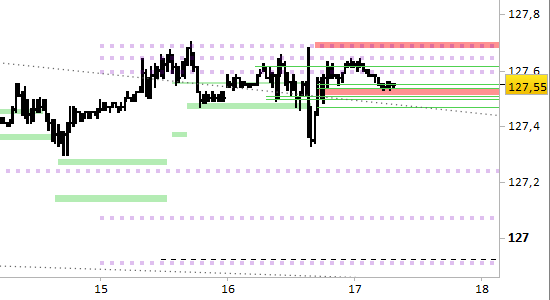 I prezzi si trovano ancora in zona di in zona di ripiegamento, fra le resistenze che confermiamo per oggi a a 127.50/54 e 127.68/72.