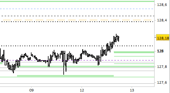 Confermiamo il target principale a 128.38 ed i supporti a 127.98/128.00 e 127.79/81.