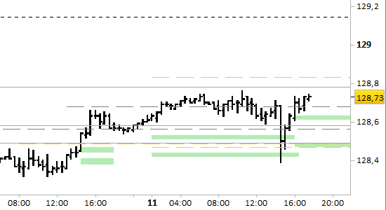 Future Bund, grafico a barre da 30 minuti. Prezzi al 11/02/26, ore 17.47, last 128.73