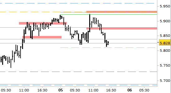 future Eurostoxx50, grafico a barre da 30 minuti. Prezzi fino al 05/03/26, ore 15.33, last 5828