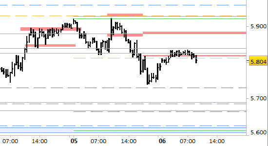 future Eurostoxx50, grafico a barre da 30 minuti. Prezzi fino al 06/03/26, ore 9.19, last 5804