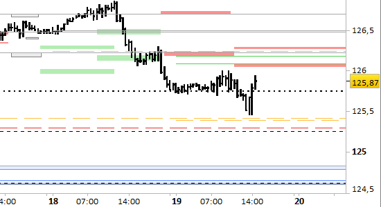 Future Bund, grafico a barre da 30 minuti. Prezzi al 19/03/26, ore 14.56, last 125.87