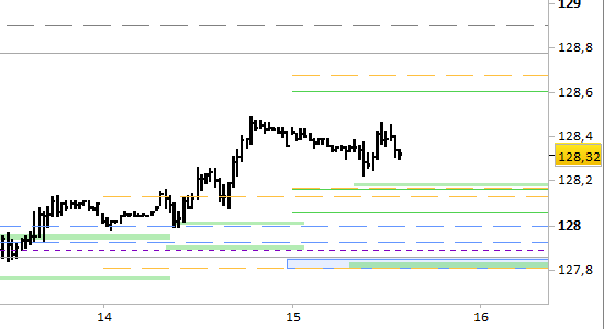 Confermiamo i supporti daily a 128.15/18 e 127.80/85, quest'ultimo coincidente oggi con il supporto principale di tendenza. Le proiezioni sono rialziste fino a 128.60 e 128.90. Conserviamo la posizione long aperta a 128.24; stop sotto 127.80 senza attendere alcuna conferma.