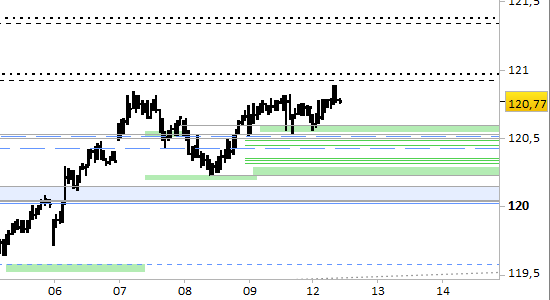 Fino a domani (=brevissimo periodo) i supporti sono confermati a 120.55/60 e 120.23/28, con obiettivi 120.92 e 121.34/121.38.