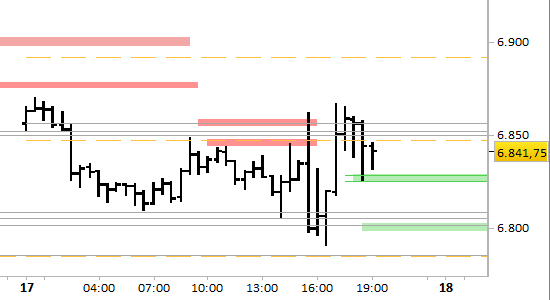 e.mini S&P future, grafico a barre da 30 minuti. Prezzi al 17/02/26, ore 19.23, last 6841.75