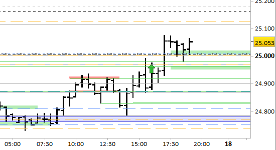 Nel brevissimo periodo (= fino a domattina) ci sono le condizioni per un ulteriore allargamento rialzista fino a 25164. Sulla strada per il target è posta una resistenza intermedia a 25115/125, da cui potrebbe scattare qualche provvisorio arretramento. I supporti a sostegno dello scenario sono fermi a 25005/015 e 24950/960. Il segnale long di brevissimo periodo rimane attivo con prezzi stabilmente superiori a 24950.