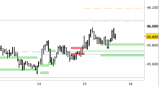Conserviamo la posizione long aperta a 45845. Stop sotto 45675 senza attendere alcuna conferma.
