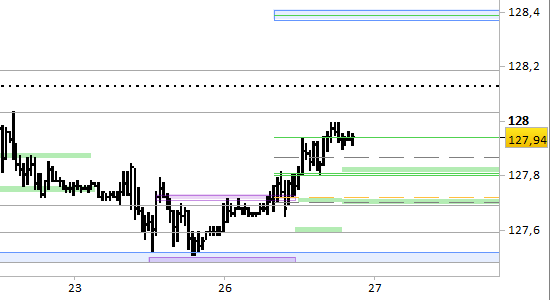 Confermiamo i supporti di brevissimo periodo (=fino a domani) a 127.80/83 e 127.69. Ci sono ancora le condizioni per un rialzo fino a 128.13/15, passando la resistenza intermedia a 128.03. Solo con rilevazioni inferiori a 127.69 saremmo costretti a rivedere lo scenario di brevissimo.