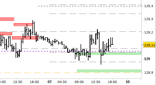 Conserviamo la posizione long aperta a 129.06. Stop sotto 128.90 senza attendere alcuna conferma.