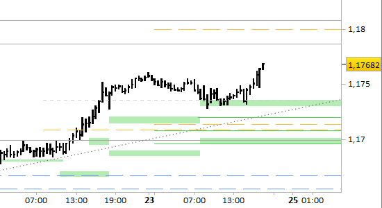 cross eur/usd, grafico a barre da 30 minuti. Prezzi al 23/01/26, ore 17.45, last 1.1768