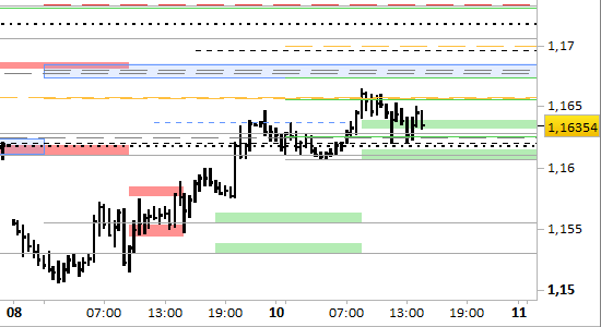 cross eur/usd, grafico a barre da 30 minuti. Prezzi al 10/03/26, ore 14.50, last 1.1635