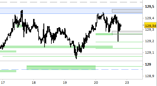 La resistenza di medio termine è ferma a 129.35/45, punto di verifica importante per lo stato della tendenza rialzista dominante a 5–10 sedute. È plausibile che dalla resistenza possano scattare dei provvisori arretramenti. Tecnicamente si tratta di una zona di probabile ripiegamento, ma non ci sono indicazioni di conferma in proposito mentre scriviamo. La tenuta o meno del livello potrà in ogni caso essere confermata solo dopo la chiusura daily. Il supporto di medio periodo è tuttora fermo a 127.80/90.
