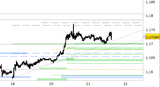 cross eur/usd, grafico a barre da 30 minuti. Prezzi al 21/01/26, ore 15.15, last 1.1726