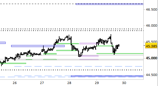 future FtseMib, grafico a barre da 30 minuti. Prezzi al 29/01/26, ore 19.50, last 45385