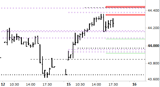 Conserviamo la posizione short aperta a 44280; stop sopra 44460 senza attendere alcuna conferma.