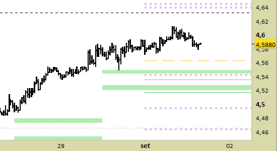 Conserviamo la posizione long aperta venerdì a 4.5635. Stop sotto 4.5210 con una chiusura su grafico a 30 minuti.