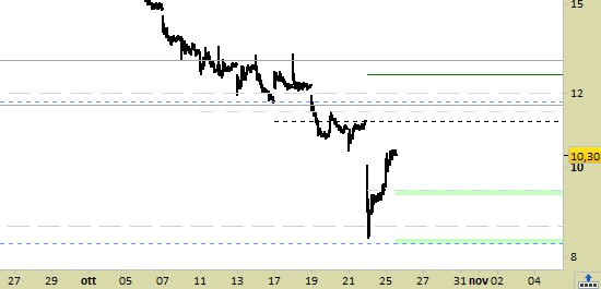 Il segnale tecnico è long solo su discese a 9.45; stop sotto 8.28 con una chiusura daily.