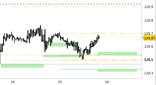 Un segnale rialzista si attiverebbe entro l’aggiornamento di domattina solo in caso di arretramenti almeno a 129.60. Si sono infatti formati supporti a 129.54/56 e 129.40/43, in grado di sorreggere un allungo fino a 129.90. Ci aspettiamo però un provvisorio riavvicinamento ai supporti prima della rottura delle due resistenze intermedie a 129.70 e 129.76. Il segnale long rimarrebbe attivo solo con prezzi stabilmente superiori a 129.40.