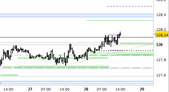 L'impostazione di brevissimo periodo (=fino a domani) pare favorevole ad un test pieno della resistenza di tendenza a 128.40, in quanto sono già attive delle proiezioni di ampliamento del rialzo fino a 128.32 e 128.50/52. I supporti che sorreggono il segnale sono disposti adesso a 128.00/128.03 e 127.85/89, punti di probabile reazione in caso di arretramenti. Solo con prezzi stabilmente inferiori a 127.85 avremmo l'interruzione del segnale.