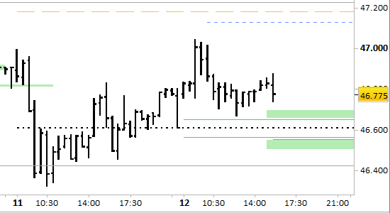 future FtseMib, grafico a barre da 30 minuti. Prezzi al 12/02/26, ore 15.47, last 46775