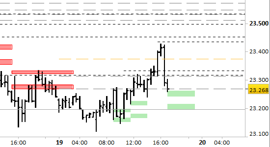 Il segnale tecnico è long a mercato e su test del primo supporto. Stop sotto 23195 senza attendere alcuna conferma.
