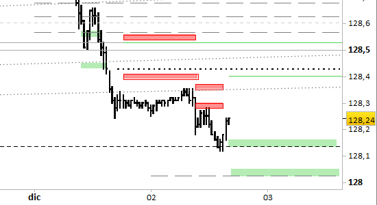 Si sono formati supporti a 128.14/16 e 128.02/04 che sono in grado di sorreggere fino a domani un rimbalzo con obiettivo a 128.42.