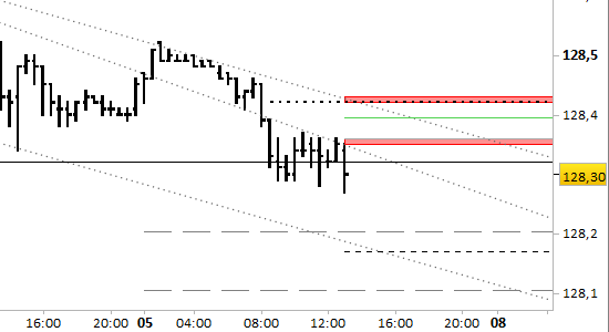 L'impostazione è ribassista fino a 128.10, passando per un primo target intermedio a 128.17.