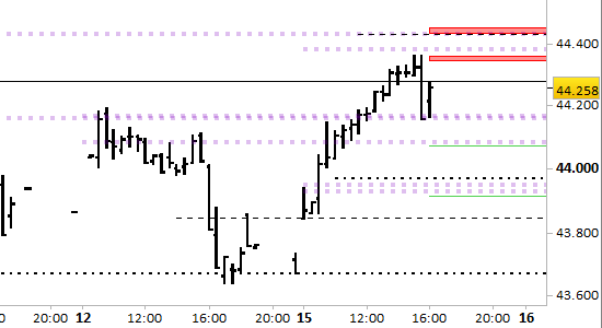 Apriamo short da prezzi non inferiori a 44280; stop sopra 44460 senza attendere alcuna conferma.