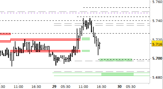 apriamo long solo su ritorni a 5706; stop sotto 5682 con una chiusura su grafico a 30 minuti.