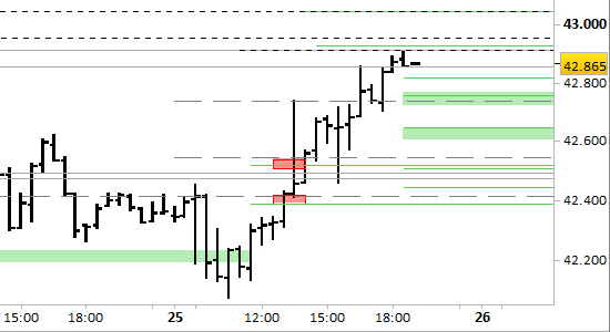 Le proiezioni sono rialziste fino a 43040, passando per la forte area di resistenza intermedia posta a 42910/960.