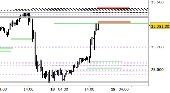 Il segnale è short a mercato e su test della prima resistenza; stop sopra 25557.00 senza attendere alcuna conferma.