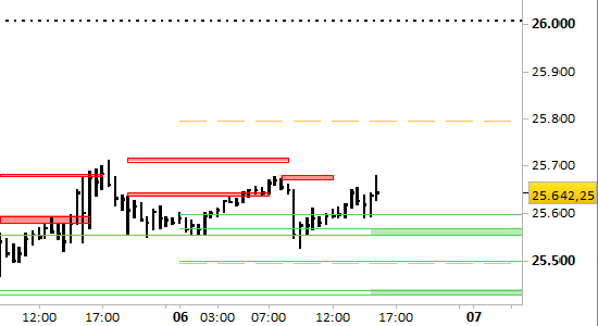 Il segnale è long a mercato e su test del primo supporto. Stop sotto 25427.00 senza attendere alcuna conferma.