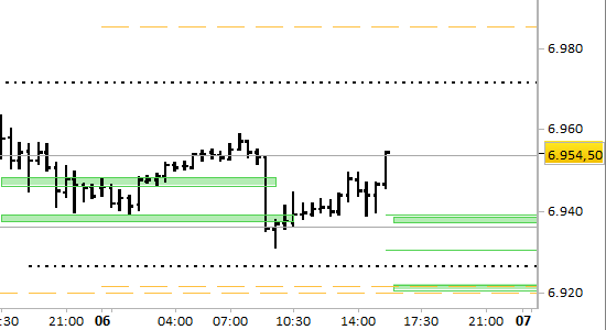 Il segnale è long da prezzi non superiori a 6945.00. Stop sotto 6920.00 senza attendere alcuna conferma.