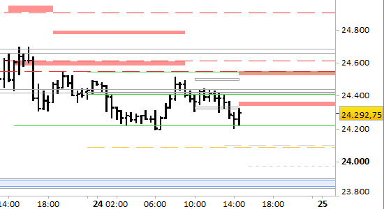 Si sono formate resistenze per il pomeriggio a 24335.00/345.00 e 24535.00/550.00, punti di ripiegamento in caso di recuperi. Si è attivato un segnale ribassista fino a 24102.00 e 24975.00. Il segnale resta attivo solo con rilevazioni stabilmente inferiori a 24550.00.