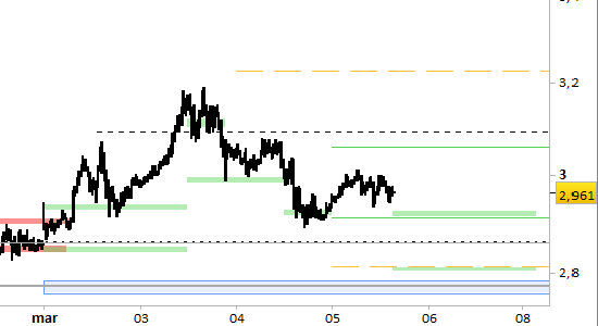 future natural gas, grafico a barre da 30 minuti. Prezzi al 05/03/26, ore 14.50, last 2.961
