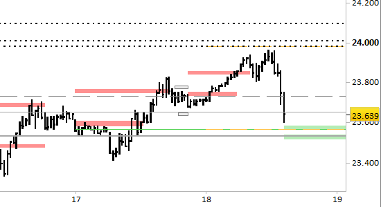 Rispetto all'ultimo aggiornamento, i prezzi hanno assunto direzionalità ribassista spostandosi dal picco di 23963 fino ai minimi odierni a 23601.